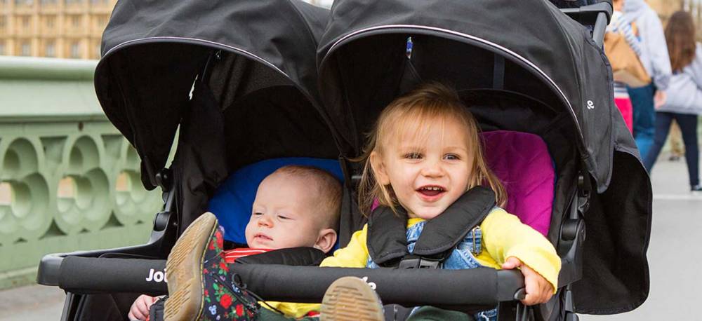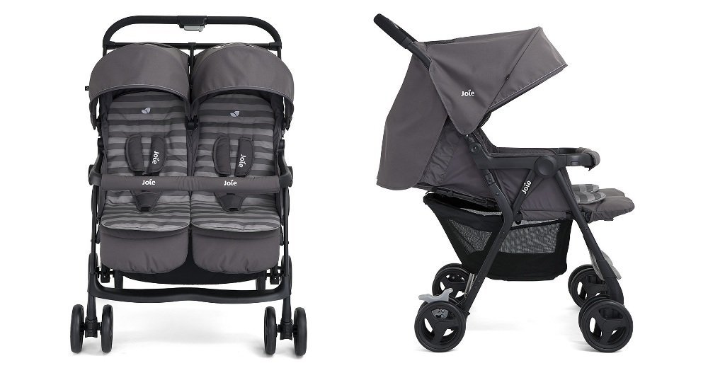 Joie Aire Twin предназначена для двойняшек или погодок. Перевозка детей в этой коляске возможна с возраста 3 месяца до примерно 3 лет, каждый ребенок не должен быть весом более 15 килограмм. Малыши смогут комфортно передвигаться на любой прогулке благодаря достаточно широким сидушкам, на которых есть удобные двухцветные матрасики. Несмотря на ширину шасси, коляска хорошо управляется за счет поворотных передних колес. Рама сделана из алюминия, коляска весит меньше 12 килограмм.
